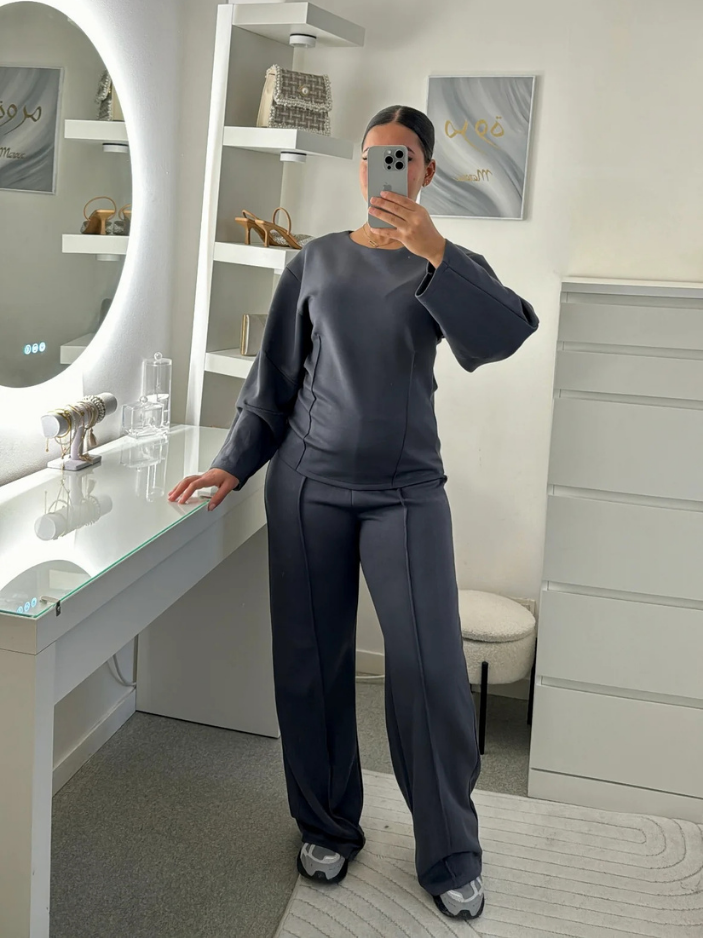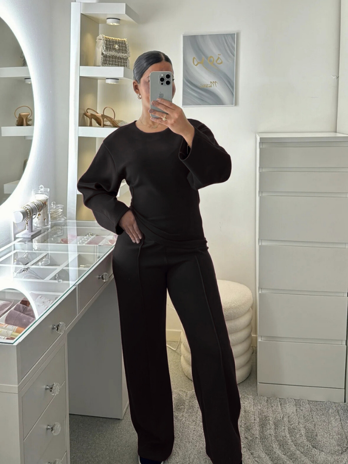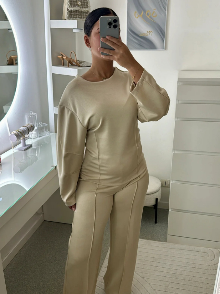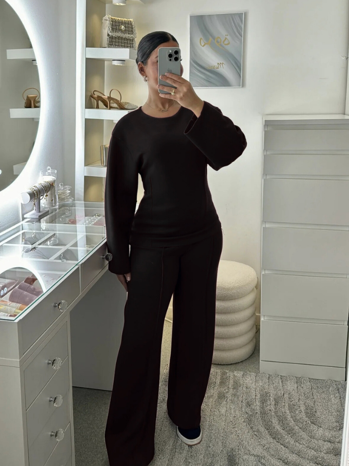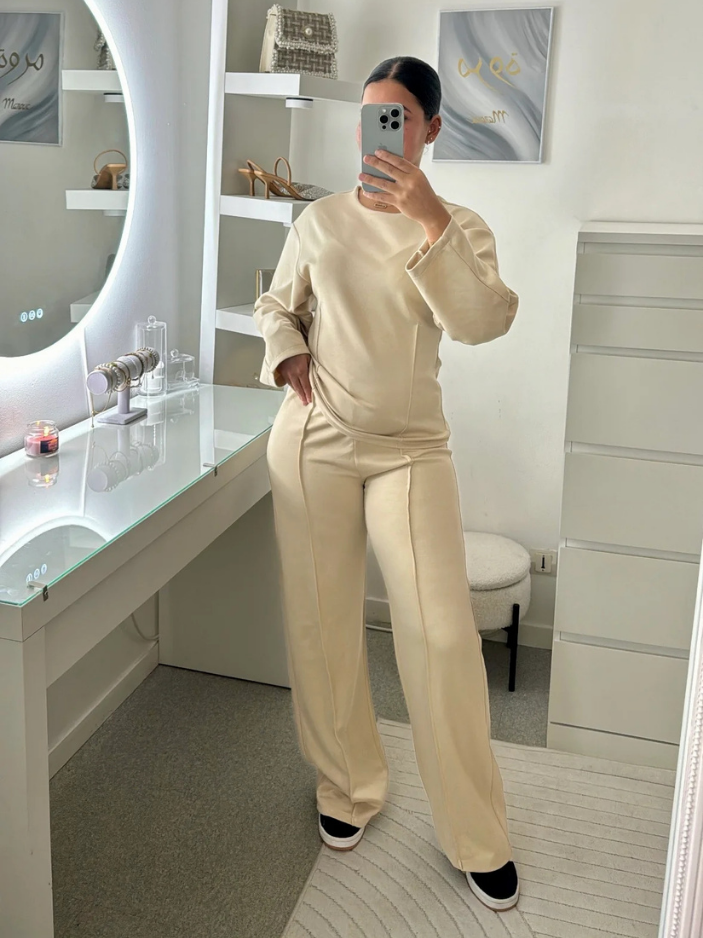 Oui, l’ensemble est conçu dans une maille interlock dense à base de coton, douce, souple et extensible, agréable à porter au quotidien. Le pantalon accompagne naturellement les mouvements grâce à sa matière stretch et sa coupe structurée, tandis que le haut ajusté à col rond et coutures marquées épouse la silhouette avec précision et maintien.