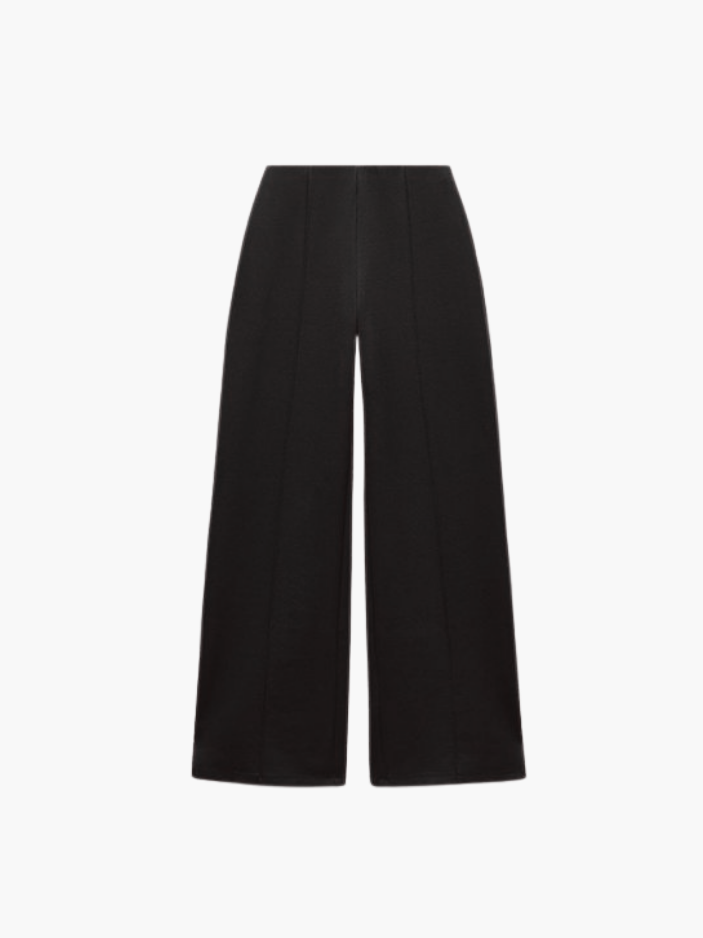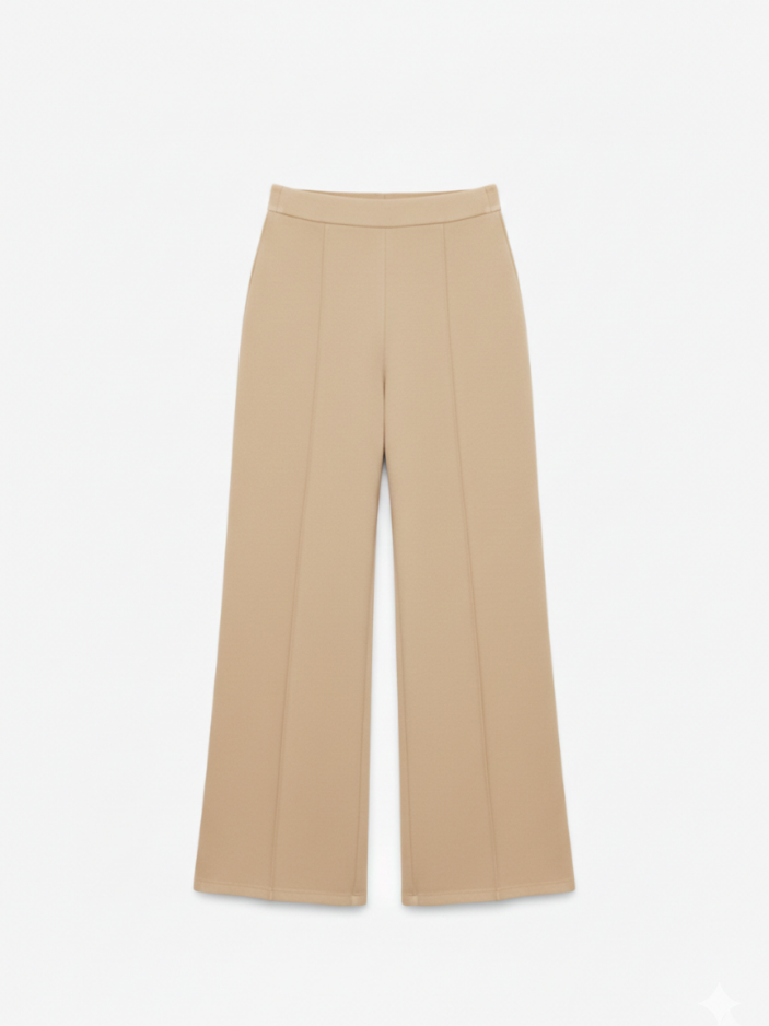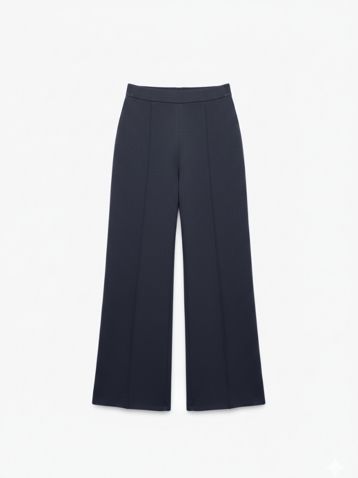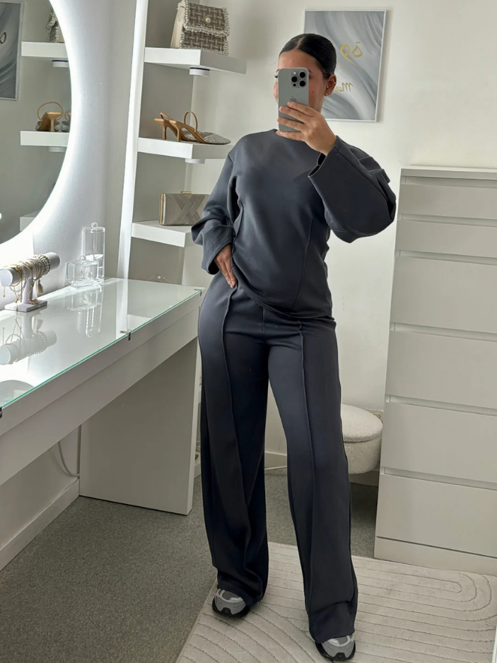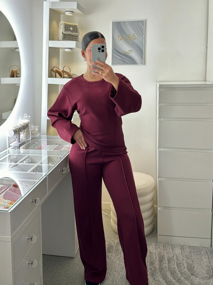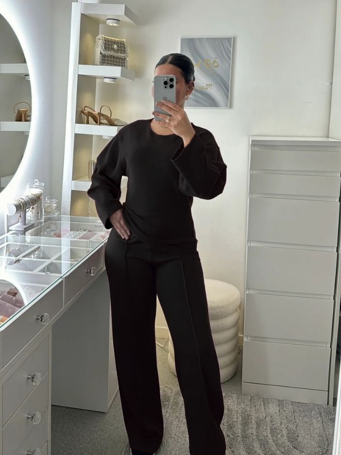 Oui, l’ensemble est conçu dans une maille interlock dense à base de coton, douce, souple et extensible, agréable à porter au quotidien. Le pantalon accompagne naturellement les mouvements grâce à sa matière stretch et sa coupe structurée, tandis que le haut ajusté à col rond et coutures marquées épouse la silhouette avec précision et maintien.